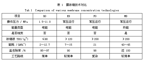 上述4种膜浓缩技术对比如表1所示。其中,普通RO浓缩能够达到的含盐量有限,需要与 FO、ED、MD 进一步组合或增设蒸发器进行再浓缩;FO虽有工程实例,但工艺路线复杂,成本高;ED技术电厂低品废热优点,在脱硫废水零排放领域具有潜在应用前景,但仍缺少适于工业化稳定运行的蒸馏膜材料。4种膜浓缩技术都需要软化,抗污染能力一般 MD>FO>ED>RO。