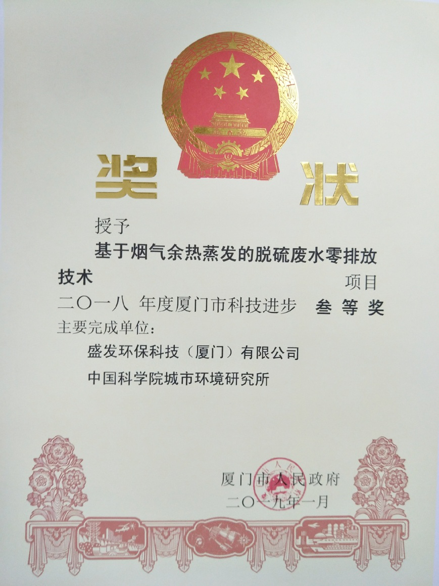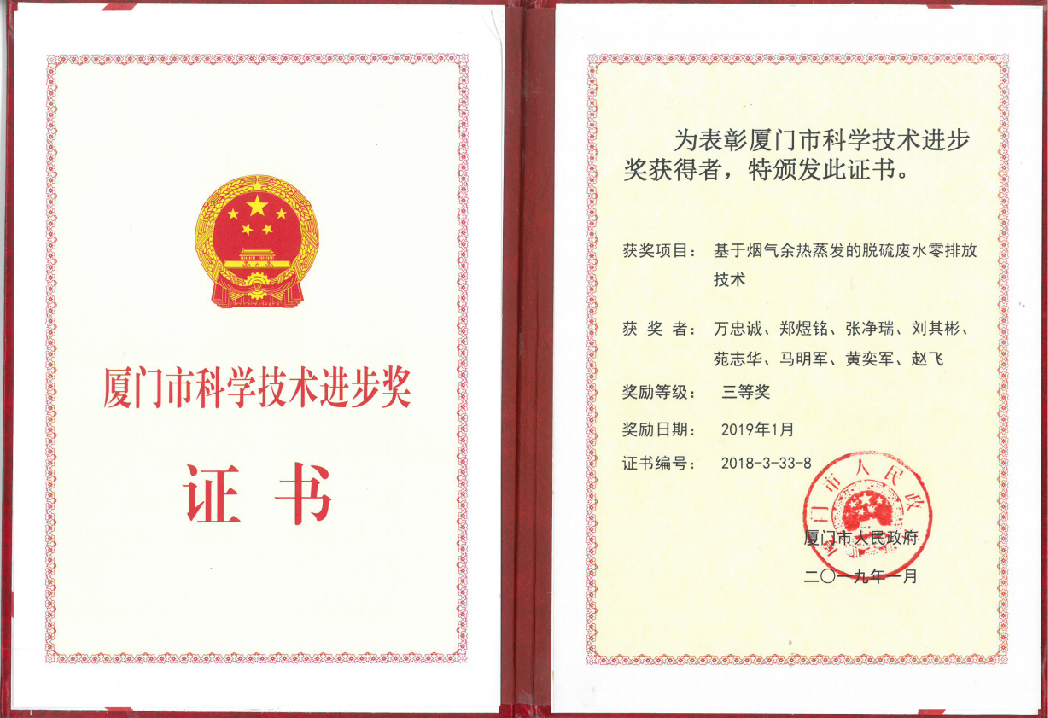 11. 取得中电机鉴[2016]第121号“基于烟气蒸发的脱硫废水零排放技术研究与应用”的环保科技成果鉴定证书,中国电机工程学会鉴定委员会认为:研究成果采用了脱硫废水预处理,攻克了尾部烟气蒸发的技术难题,提供了一种低成本脱硫废水零排放的技术,具有良好的经济、社会和环境效益,推广应用前景广阔,达到国际领先水平。
