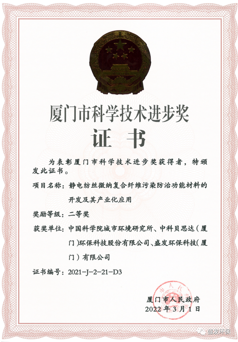 盛发环保与中国科学院城市环境研究所、中科贝思达(厦门)环保科技股份有限公司共同开发的“静电纺丝微纳复合纤维污染防治功能材料的开发及其产业化应用”项目于2022年3月1日获得厦门市人民政府颁发的“厦门市科学技术进步奖二等奖”,特此祝贺!